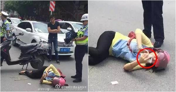 ไม่ใช่เรื่องแปลกที่โลกยุคใหม่ใคร ๆ ก็ติดโซเชียลกัน แต่อะไรมันจะขนาดนั้นคะเจ๊ขา เว็บไซต์เดลี่เมล รายงานข่าวจากประเทศจีนเมื่อวันที่ 20 พฤษภาคม ว่า เกิดอุบัติเหตุคนขับรถจักรยานยนต์ถูกเก๋งเฉี่ยวชนจนรถล้มกลาง2559 ถนนในเมืองเจียงหยู มณฑลเสฉวน ฝ่ายหญิงผู้ขับรถจักรยานยนต์ที่ดูแล้วจะเป็นฝ่ายคนเจ็บก็ควักมือถือออกมา ผู้คนคิดว่าเธอคงโทรหาสามีหรือใครในครอบครัวเพื่อแจ้งข่าวอุบัติเหตุ แต่เปล่าเลย เธอหยิบมันออกมาเล่นเน็ต ! โดยผู้อยู่ในเหตุการณ์เผยกับ People's Daily ว่า เห็นเธอหยิบมาเล่น WeChat แอพแชทยอดฮิตของแดนมังกร โดยไม่สนใจจะสำรวจความเสียหายหรือเดือดเนื้อร้อนใจที่การจราจรต้องมาติดขัดเพราะเธอมานอนแหมะอยู่แบบนี้